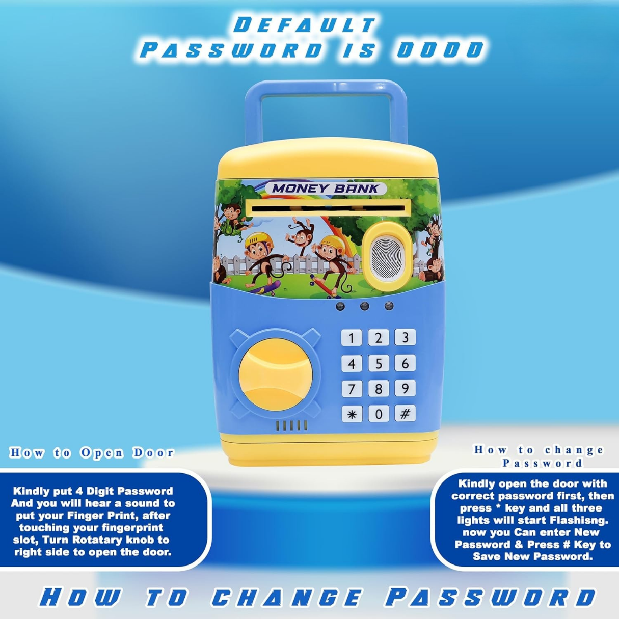 Give your child the thrill of a “real” safe with this ATM money saving piggy bank - a fun way to build saving habits. It features a secret code lock with electronic lock feedback, light & sound cues, and both coin and paper money entry, making deposits easy and exciting. After entering the correct code, kids press the fingerprint button to open, adding that authentic safe-like feel. A rotary switch unlocks the door, and a sturdy top handle lets them carry their treasure anywhere—perfect as a kids gift for birthdays and rewards.