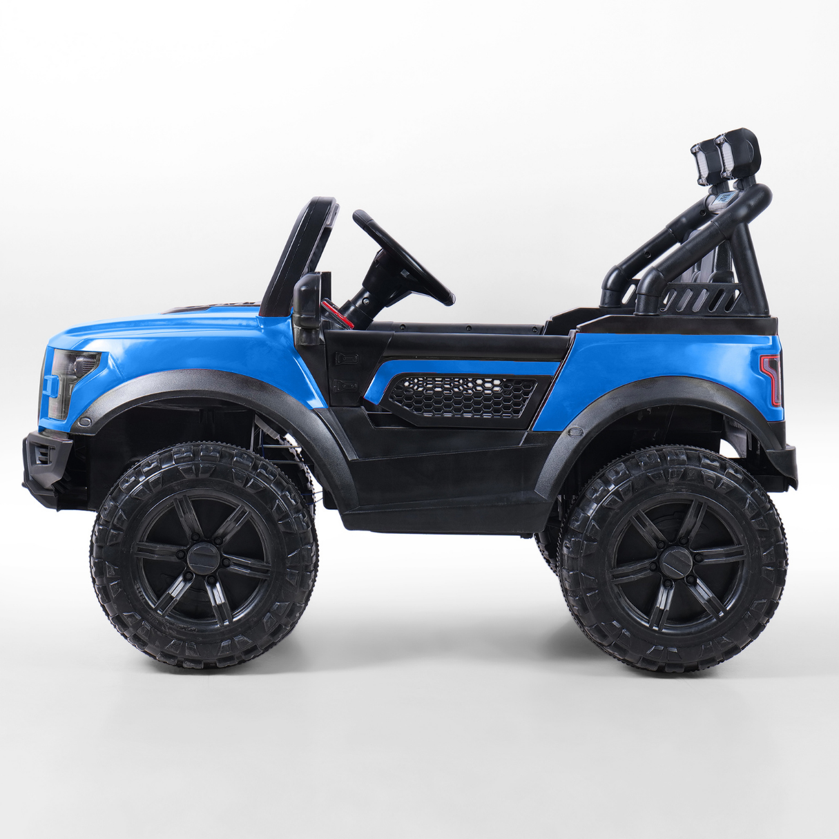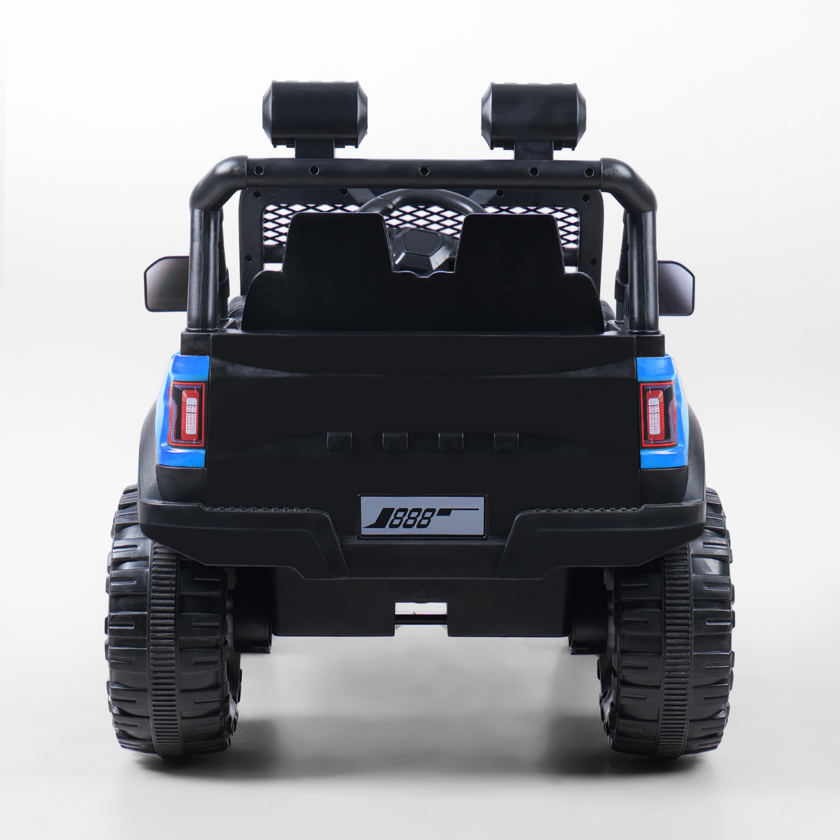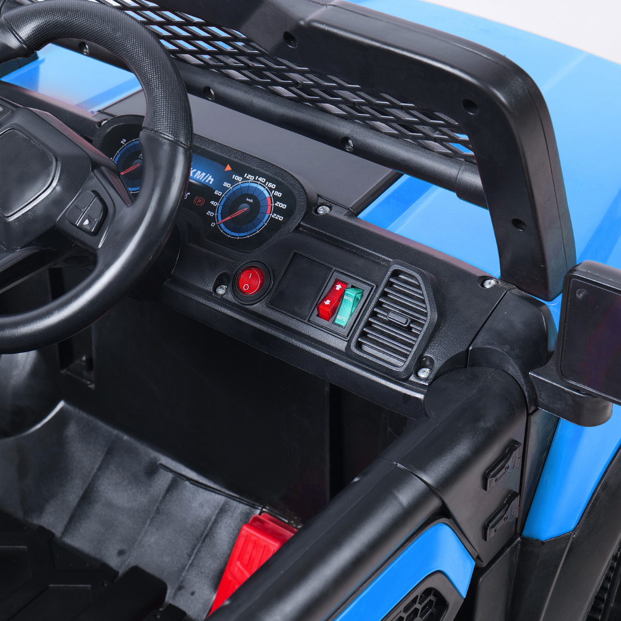 • Dual Control Modes – Remote control or independent driving with accelerator, steering wheel, and forward/backward gear. Powered by 12V battery and 2 motors.